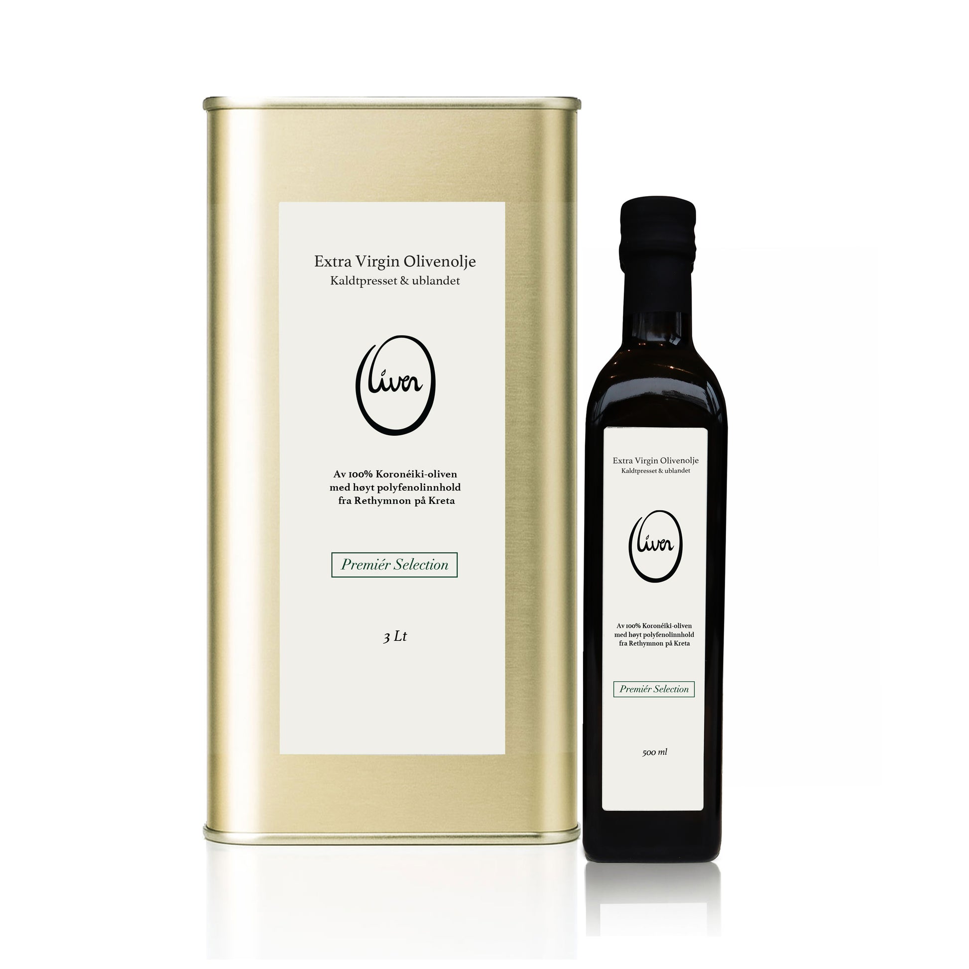 Oliven® Premiér Selection i to praktiske størrelser: Elegant 500ml-flaske til kjøkkenbenken og praktisk 3liters-boks for lagring og påfyll.